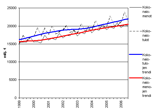 Kahden viimeisimmän vuoden tiedot ovat ennakollisia ja tarkentuvat kansantalouden tilinpidon vuositietojen tarkentuessa. Kuvioissa trendi on laskettu Tramo/Seats-menetelmällä. Trendi voi tarkentua tulevina periodeina, kun ennakolliset havainnot tarkentuvat. Vuositilinpidon aikasarjojen tarkentuessa tarkentuvat myös tämän tilaston aikasarjat. Tiedot perustuvat 20.12.2006 mennessä käytettävissä olleisiin tietoihin talouskehityksestä. Tietoja tarkistetaan seuraavan kerran maaliskuun 2007 lopussa.