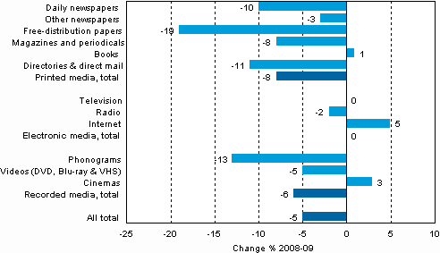 The media market contracted by five per cent in 2009. The drop remained somewhat smaller than estimated in Statistics Finland's preliminary data (of 17 June 2010). Nevertheless, this represents the biggest annual drop in post-war time. For example, during the recession in the early 1990s annual changes ranged around -3 to -4 per cent.