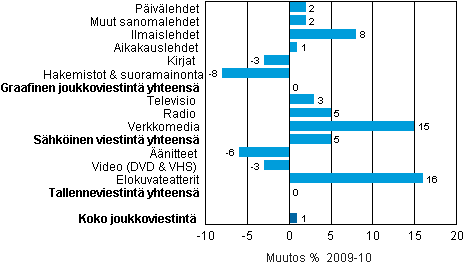 Joukkoviestintämarkkinoiden muutokset 2009–2010 (%)