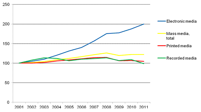 Over the 2000s, the growth of the mass media market has hinged mostly on electronic media. The combined turnover of television, radio and web media has doubled. Printed media was in 2011 only barely over the level of 2001 and the recording market dropped last year even slightly under the level at the start of the millennium.