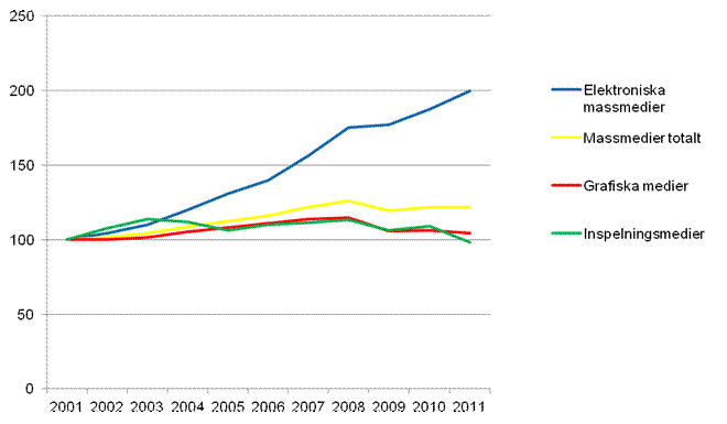 Massmediemarknadens tillväxt har under 2000-talet varit beroende främst av de elektroniska medierna. Televisionens, radions och webbmediernas sammanräknade omsättning har fördubblats. Tryckt media låg år 2011 bara knappt över nivån för år 2001 och inspelningsmarknaden sjönk förra året t.o.m. något under nivån för början av årtusendet.