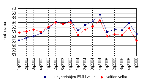 Julkisyhteisöjen EMU-velka laski vuoden 2006 ensimmäisen neljänneksen aikana lähes 5 miljardia euroa ollen maaliskuun lopussa 58,9 miljardia euroa. Velan lasku oli seurausta valtion velan pienenemisestä 5,3 miljardilla eurolla. Kuntien velka kasvoi sen sijaan hieman (0,2 mrd) ja sosiaaliturvarahastojen velka pysyi ennallaan. Valtion velan vähentämisen mahdollistivat mm. alkuvuoden odotettua suuremmat verotulot sekä valtion saamat osinkotulot. Julkisyhteisöjen velka laski voimakkaasti myös vuosien 2004 ja 2005 ensimmäisillä neljänneksillä.