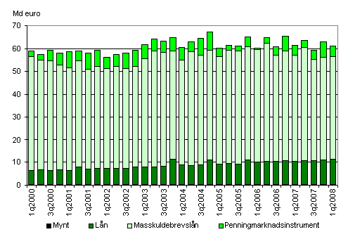 Den offentliga sektorns nominella EMU-skuld minskade med 1,8 miljarder euro under det första kvartalet år 2008. Att EMU-skulden varierar efter kvartal beror vanligen på förändringar i statens masskuldebrevslån och kortfristiga penningmarknadsinstrument, medan lånebeloppet har varit rätt så oförändrat. I slutet av det första kvartalet var den offentliga sektorns skuld 61,1 miljarder euro, vilket var nästan lika mycket som året innan.