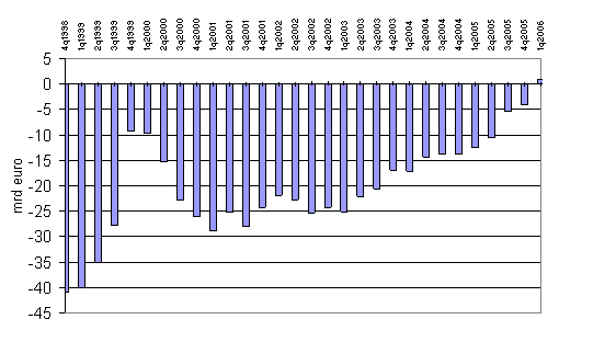 Den offentliga sektorns finansiella tillgångar ökade med över 4 miljarder euro under det första kvartalet år 2006. Samtidigt amorterade den offentliga sektorn sina skulder med nästan 6 miljarder euro. Den kraftiga stegringen av aktieplaceringarnas värde inverkade på ökningen av de finansiella tillgångarna. De finansiella nettotillgångarna, som beskriver skillnaden mellan de finansiella tillgångarna och skulderna, steg således totalt med något över 10 miljarder euro. Socialskyddsfondernas andel av beloppet var 4,3 miljarder, kommunernas 0,6 miljarder och statens 5,0 miljarder euro. Statens finansiella nettotillgångar visade nu ett positivt belopp, medan de ännu i slutet av år 1998 var negativa med över 40 miljarder euro.