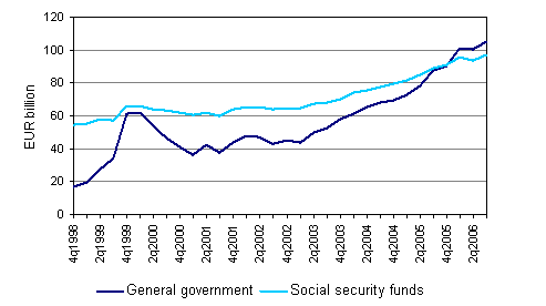 During the third quarter of 2006, the value of general government net financial assets grew by EUR 4.7 billion from the second quarter. Social security funds' net financial assets grew by EUR 3.5 billion and central government's assets by EUR 1.2 billion. The growth in net assets was influenced by holding gains in investments in shares and funds, which added nearly EUR 3 billion to the value of general government financial assets.