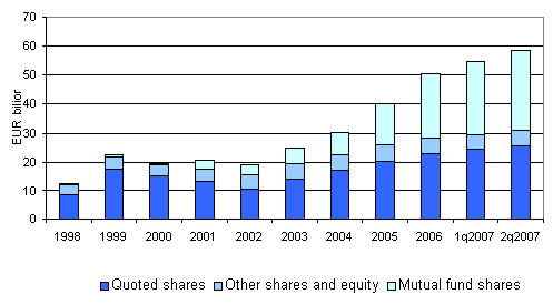 The market value of the shares held by employment pension schemes was EUR 58.5 billion at the end of the second quarter of 2007. Thanks to favourable share price development the value was up by EUR 3.8 billion on the previous quarter. During the reviewed period, employment pension schemes increased their investments in mutual funds by EUR 1.8.