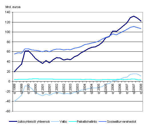 Julkisyhteisöjen nettorahoitusvarallisuus kääntyi laskuun viime vuoden viimeisellä neljänneksellä ja jatkoi laskuaan vuoden 2008 ensimmäisellä neljänneksellä 5,9 miljardilla eurolla 121,9 miljardiin euroon. Valtion nettorahoitusvarallisuus pieneni 3,9 miljardilla eurolla ja sosiaaliturvarahastojen 2,1 miljardilla eurolla. Valtion ja sosiaaliturvarahastojen nettovarallisuuden laskuun vaikutti erityisesti osakemarkkinoiden epäsuotuisan kurssikehityksen aiheuttamat hallussapitotappiot. Paikallishallinnon nettorahoitusvarallisuudessa ei tapahtunut juurikaan muutosta edelliseen neljännekseen verrattuna.