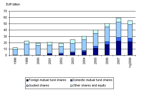 In consequence of negative development in share prices, the market value of the shares and other equity held by general government fell by EUR 7.7 billion, even though general government increased its investments in shares by EUR 2.4 billion at the same time. For a long time now employment pension schemes have been increasing their holdings in foreign funds. At the end of the quarter they had invested in them as much as 40 per cent of all their investments in shares.