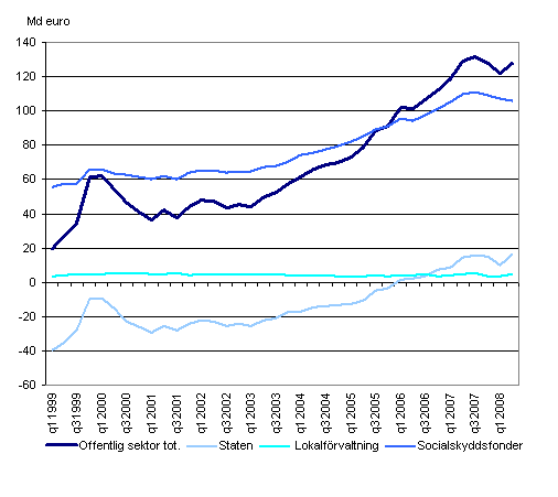 Den offentliga sektorns finansiella nettotillgångar ökade under det andra kvartalet år 2008 med 6,0 miljarder euro och uppgick till 127,9 miljarder euro. Statens finansiella nettotillgångar ökade med 5,7 miljarder euro och lokalförvaltningens med 1,1 miljarder euro. Socialskyddsfondernas finansiella nettotillgångar minskade med 0,8 miljarder euro. Ökningen av statens finansiella nettotillgångar berodde i synnerhet på att insättningarna ökade med 3,8 miljarder euro.
