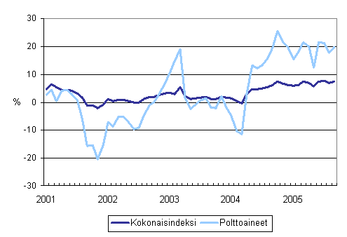 Kuorma-autoliikenteen kaikkien kustannusten ja polttoainekustannusten vuosimuutokset 1/2001 - 9/2005