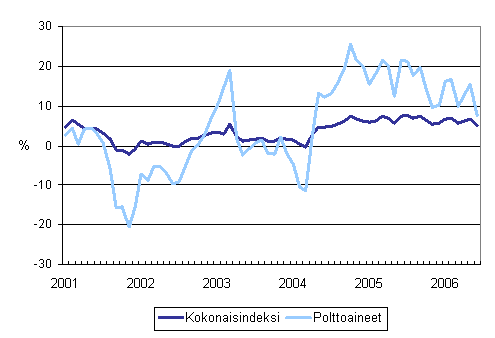 Kuorma-autoliikenteen kaikkien kustannusten ja polttoainekustannusten vuosimuutokset 1/2001 - 6/2006