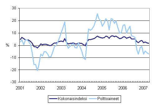 Kuorma-autoliikenteen kaikkien kustannusten ja polttoainekustannusten vuosimuutokset 1/2001 - 4/2007