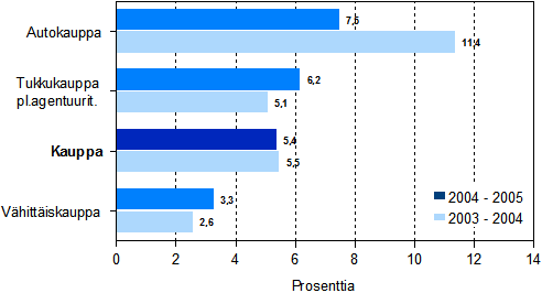 Voimakkainta liikevaihdon kasvu oli tukkukaupassa, jonka liikevaihto ylsi 52,8 miljardiin euroon. Kannattavuudessa ei tapahtunut olennaisia muutoksia. Omavaraisuusaste sen sijaan heikkeni 1,4 prosenttiyksikköä edellisestä vuodesta ja oli 43,8 prosenttia taseesta. Vähittäiskaupan liikevaihto kasvoi 3,3 prosenttia edellisvuodesta ja oli 28,1 miljardia euroa. Voittoa vähittäiskauppa sai edellisvuoden tapaan miljardi euroa eli 3,7 prosenttia tuotoista.