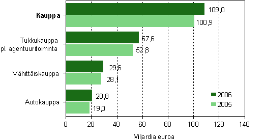 Kaupan liikevaihto kohosi vuonna 2006 Tilastokeskuksen ennakkotietojen mukaan 109 miljardiin euroon, kasvua edellisestä vuodesta oli 8,1 prosenttia. Kaupan liikevaihdon 8,1 miljardin euron kasvusta yli puolet tuli tukkukaupasta. Tukkukauppa keräsi liikevaihtoa 57,6 miljardia ja vähittäiskauppa 29,6 miljardia euroa. Autokauppa kasvoi edellisvuoden tapaan voimakkaasti. Liikevaihtoa autokaupat keräsivät 20,8 miljardia euroa, kasvuprosentin ollessa 9,7.