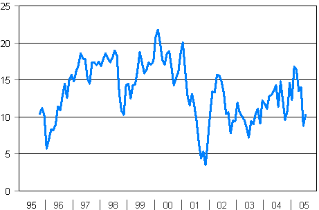 | Heinäkuu 2005 saldoluku | Kesäkuu 2005 saldoluku | Heinäkuu 2004 saldoluku | Keskiarvo 10/95-7/05 | |||||