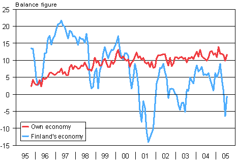 Consumers' expectations concerning their own and Finland's economy in 12 months' time 10/1995-7/2005