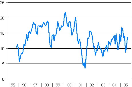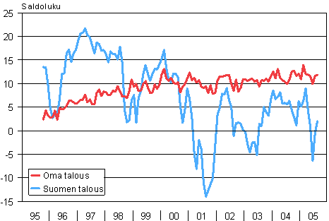 | Elokuu 2005 saldoluku | Heinäkuu 2005 saldoluku | Elokuu 2004 saldoluku | Keskiarvo 10/95-8/05 | |||||