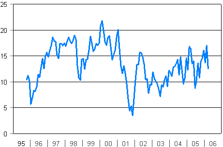 | Maaliskuu 2006 saldoluku | Helmikuu 2006 saldoluku | Maaliskuu 2005 saldoluku | Keskiarvo 10/95-3/06 | |