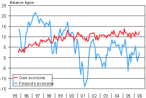 Consumers' expectations concerning their own and Finland's economy in 12 months' time 10/1995-6/2006