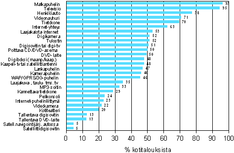 Eri laitteiden ja yhteyksien yleisyys kotitalouksissa elokuussa 2006