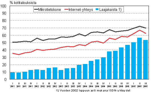 Tietokoneiden ja internet-yhteyksien yleisyys kotitalouksissa neljännesvuosittain helmikuusta 2001 elokuuhun 2006