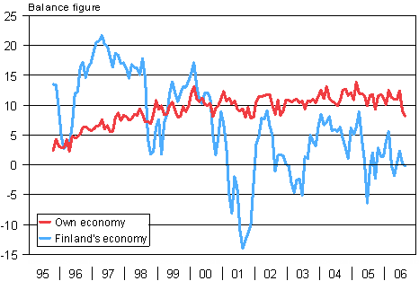 Consumers' expectations concerning their own and Finland's economy in 12 months' time 10/1995-8/2006