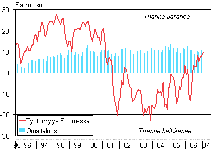 A1 Kuluttajien odotukset työttömyydestä Suomessa ja omasta taloudestaan vuoden kuluttua 10/1995-01/2007