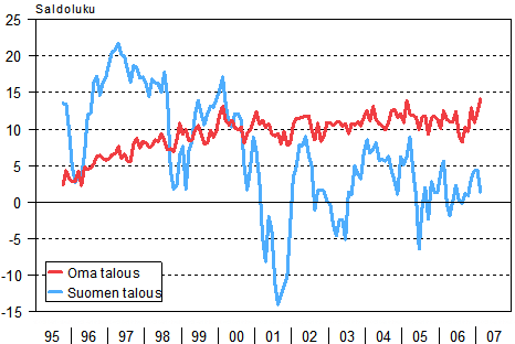 | Helmikuu 2007 saldoluku | Tammikuu 2007 saldoluku | Helmikuu 2006 saldoluku | Keskiarvo 10/95-2/07 | |