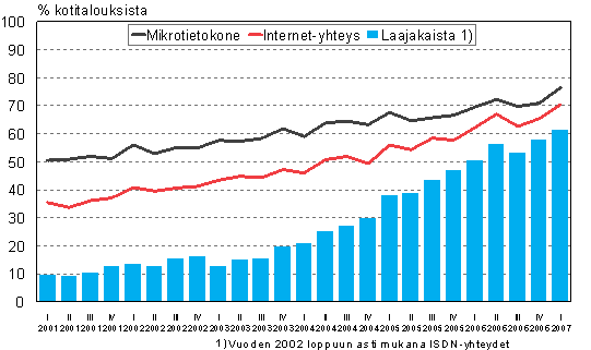 C2 Tietokoneiden ja internet-yhteyksien yleisyys kotitalouksissa neljännesvuosittain helmikuusta 2001 helmikuuhun 2007