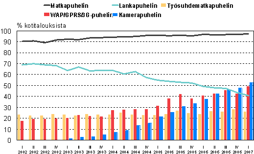 C3 Telelaitteet: puhelimien yleisyys kotitalouksissa neljännesvuosittain helmikuusta 2002 helmikuuhun 2007