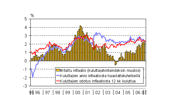 A7 Kuluttajien inflaationäkemykset ja mitattu inflaatio 10/1995-3/2007