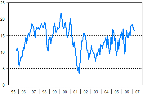 | Maaliskuu 2007 saldoluku | Helmikuu 2007 saldoluku | Maaliskuu 2006 saldoluku | Keskiarvo 10/95-3/07 | |