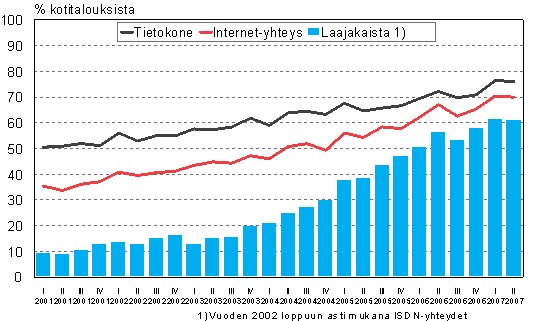 C2 Tietokoneiden ja internet-yhteyksien yleisyys kotitalouksissa neljännesvuosittain helmikuusta 2001 toukokuuhun 2007