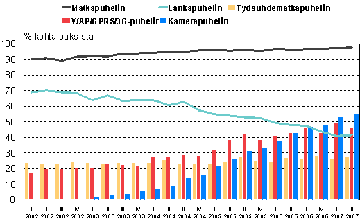 C3 Telelaitteet: puhelimien yleisyys kotitalouksissa neljännesvuosittain helmikuusta 2002 toukokuuhun 2007
