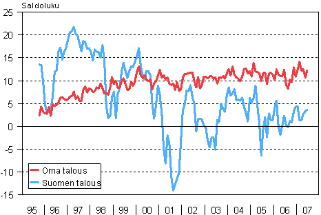 | Kesäkuu 2007 saldoluku | Toukokuu 2007 saldoluku | Kesäkuu 2006 saldoluku | Keskiarvo 10/95-6/07 | |||||
