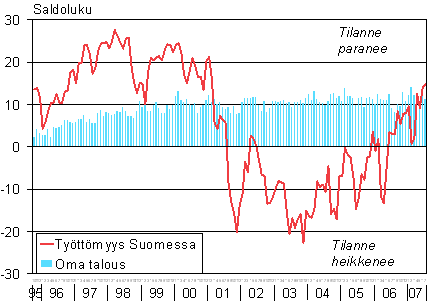 A1 Kuluttajien odotukset työttömyydestä Suomessa ja omasta taloudestaan vuoden kuluttua 10/1995 - 7/2007