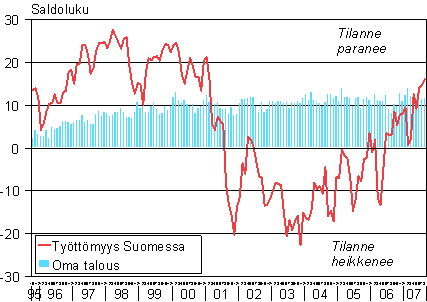 A1 Kuluttajien odotukset työttömyydestä Suomessa ja omasta taloudestaan vuoden kuluttua 10/1995 - 8/2007
