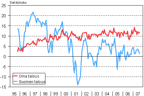 - A1 Kuluttajien odotukset työttömyydestä Suomessa ja omasta taloudestaan vuoden kuluttua 10/1995 - 8/2007 (27.8.2007)