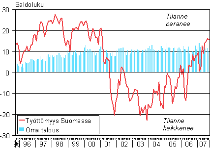 A1 Kuluttajien odotukset työttömyydestä Suomessa ja omasta taloudestaan vuoden kuluttua 10/1995 - 9/2007