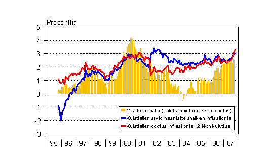 A7 Kuluttajien inflaationäkemykset ja mitattu inflaatio 10/1995 - 10/2007