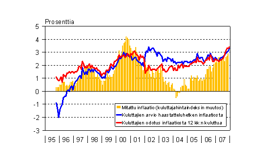 A7 Kuluttajien inflaationäkemykset ja mitattu inflaatio 10/1995 - 12/2007