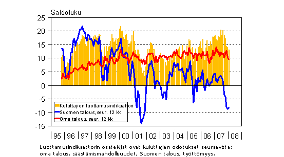 A0 Kuluttajien odotukset taloudesta ja kuluttajien luottamusindikaattori 10/1995 - 1/2008