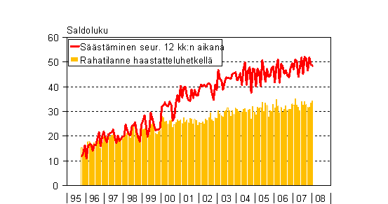 A2 Kuluttajien arviot kotitaloutensa säästämismahdollisuuksista seuraavan 12 kk aikana ja rahatilanteesta haastatteluhetkellä 10/1995 - 1/2008