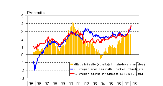 A7 Kuluttajien inflaationäkemykset ja mitattu inflaatio 10/1995 - 1/2008