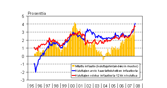 A7 Kuluttajien inflaationäkemykset ja mitattu inflaatio 10/1995 - 2/2008