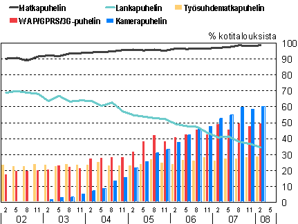 C3 Telelaitteet: puhelimien yleisyys kotitalouksissa neljännesvuosittain helmikuusta 2002 helmikuuhun 2008