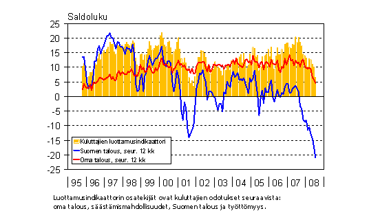 A0 Kuluttajien odotukset taloudesta ja kuluttajien luottamusindikaattori 10/1995 - 7/2008