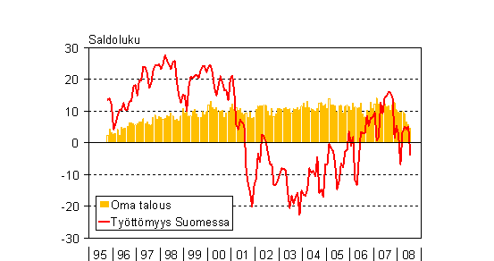 A1 Kuluttajien odotukset työttömyydestä Suomessa ja omasta taloudestaan vuoden kuluttua 10/1995 - 7/2008