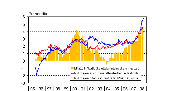 A7 Kuluttajien inflaationäkemykset ja mitattu inflaatio 10/1995 - 8/2008
