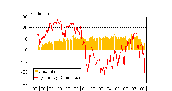A1 Kuluttajien odotukset työttömyydestä Suomessa ja omasta taloudestaan vuoden kuluttua 10/1995 - 10/2008